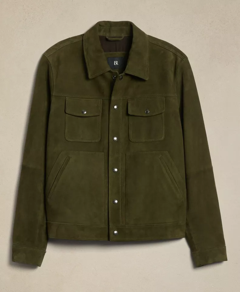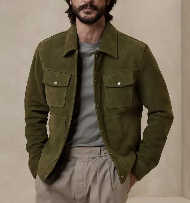 The High Quality Green Mens Suede Jacket is a perfect blend of elegance and casual sophistication. Crafted from premium suede, this Banana Republic Mens Suede Jacket exudes luxury while offering a versatile wardrobe staple for men who appreciate quality and style. Its refined design works effortlessly for both everyday wear and special occasions, providing a polished, stylish look whether paired with jeans, chinos, or tailored trousers.