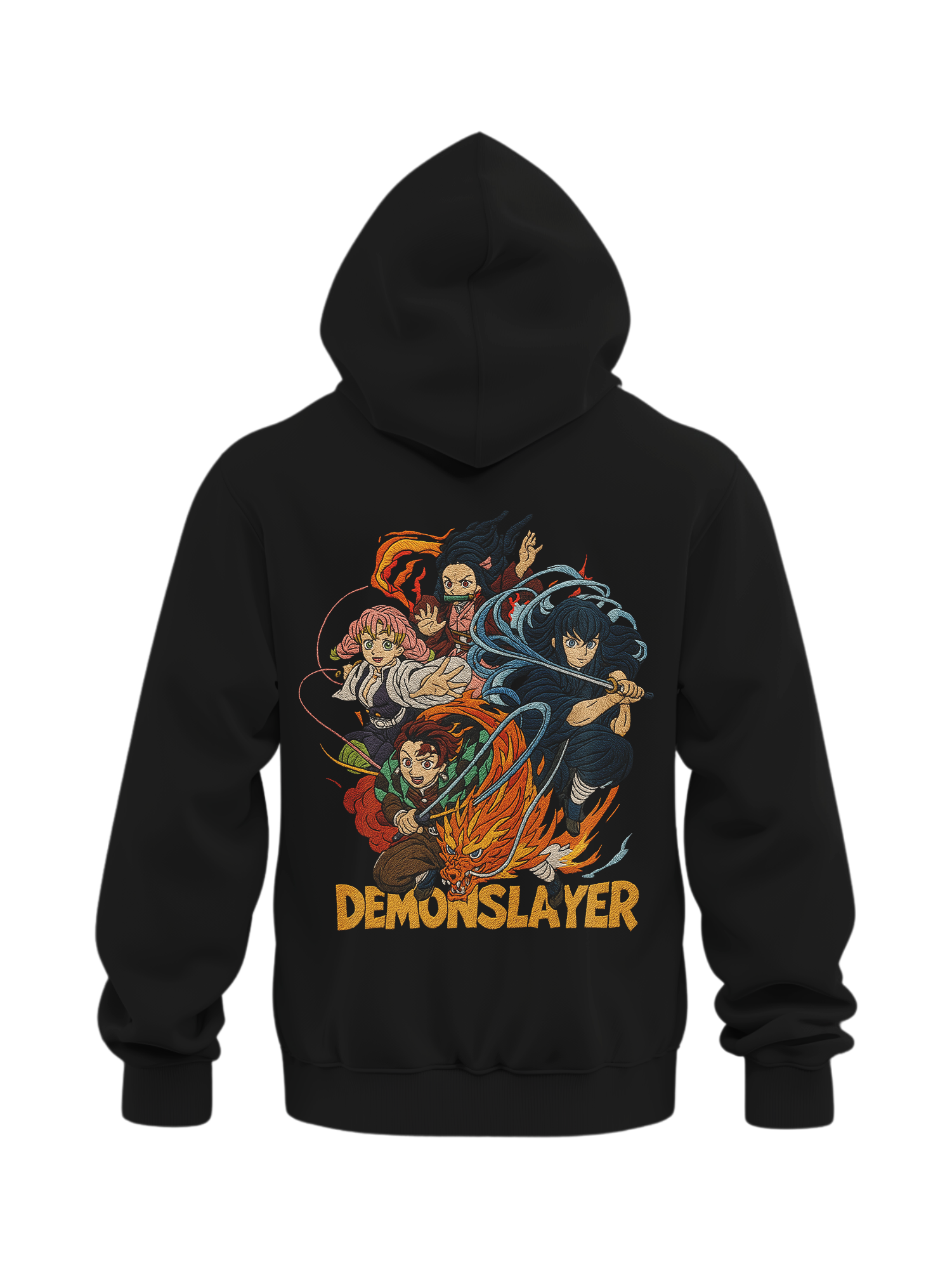 This embroidered hoodie features the Demon Slayer squad with Tanjiro, Nezuko, Mitsuri, and Giyu in battle mode. The design is stitched directly for a bold, long-lasting effect with fire and water details. Part of the Custom Anime Hoodies Demon Slayer series, it pairs with the Hashira hoodies for a full anime collection.