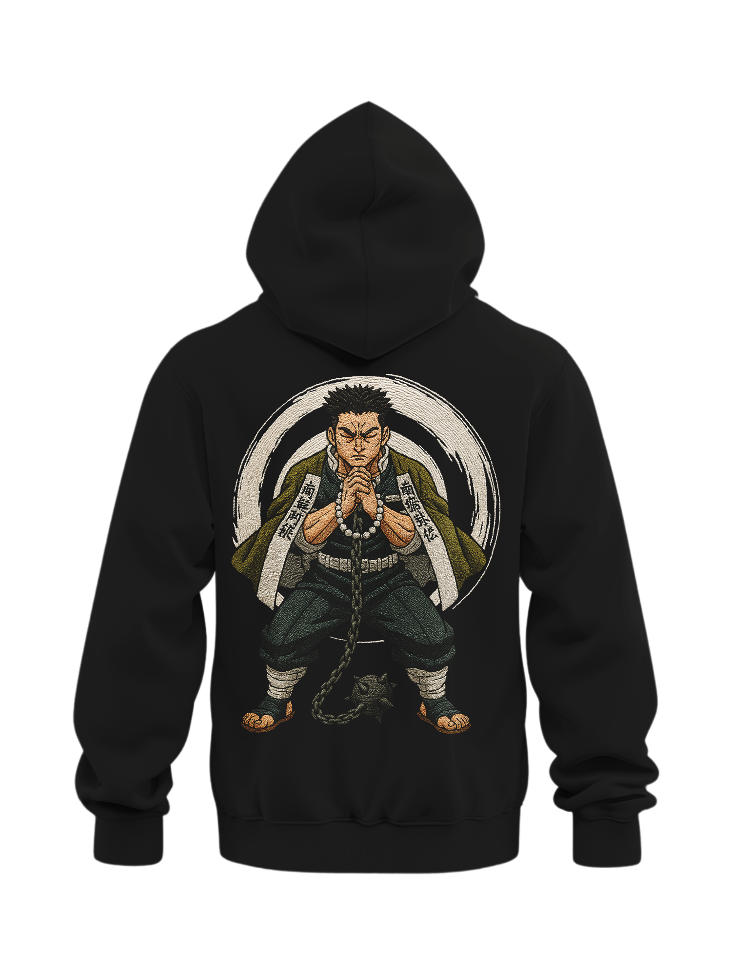This embroidered hoodie features Gyomei Himejima from Demon Slayer, the Stone Hashira. The artwork is stitched into the hoodie, showing Gyomei in prayer with his weapon inside a stone-inspired circle. Part of the Custom Anime Hoodies Demon Slayer collection, this hoodie matches well with Shinobu, Sanemi, Obanai, and Muichiro.