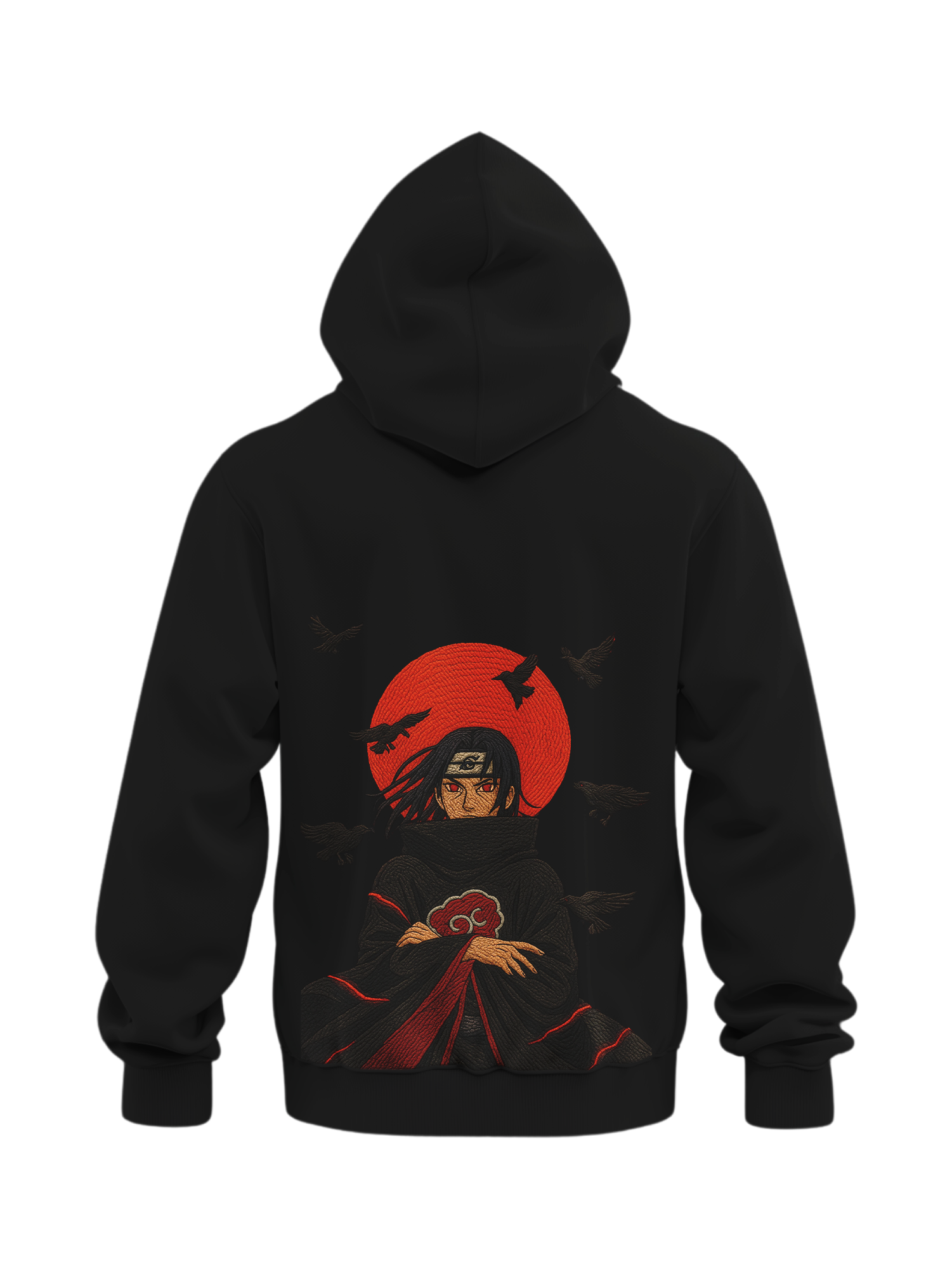 This embroidered hoodie features Itachi Uchiha from Naruto Shippuden, one of the most iconic characters in the series. The embroidery is stitched directly into the hoodie, showing Itachi in his Akatsuki cloak with a red moon and crows. Part of the Custom Anime Hoodies anime hoodie lineup, this design connects with our Demon Slayer and Attack on Titan embroidered hoodies for fans who love anime streetwear.