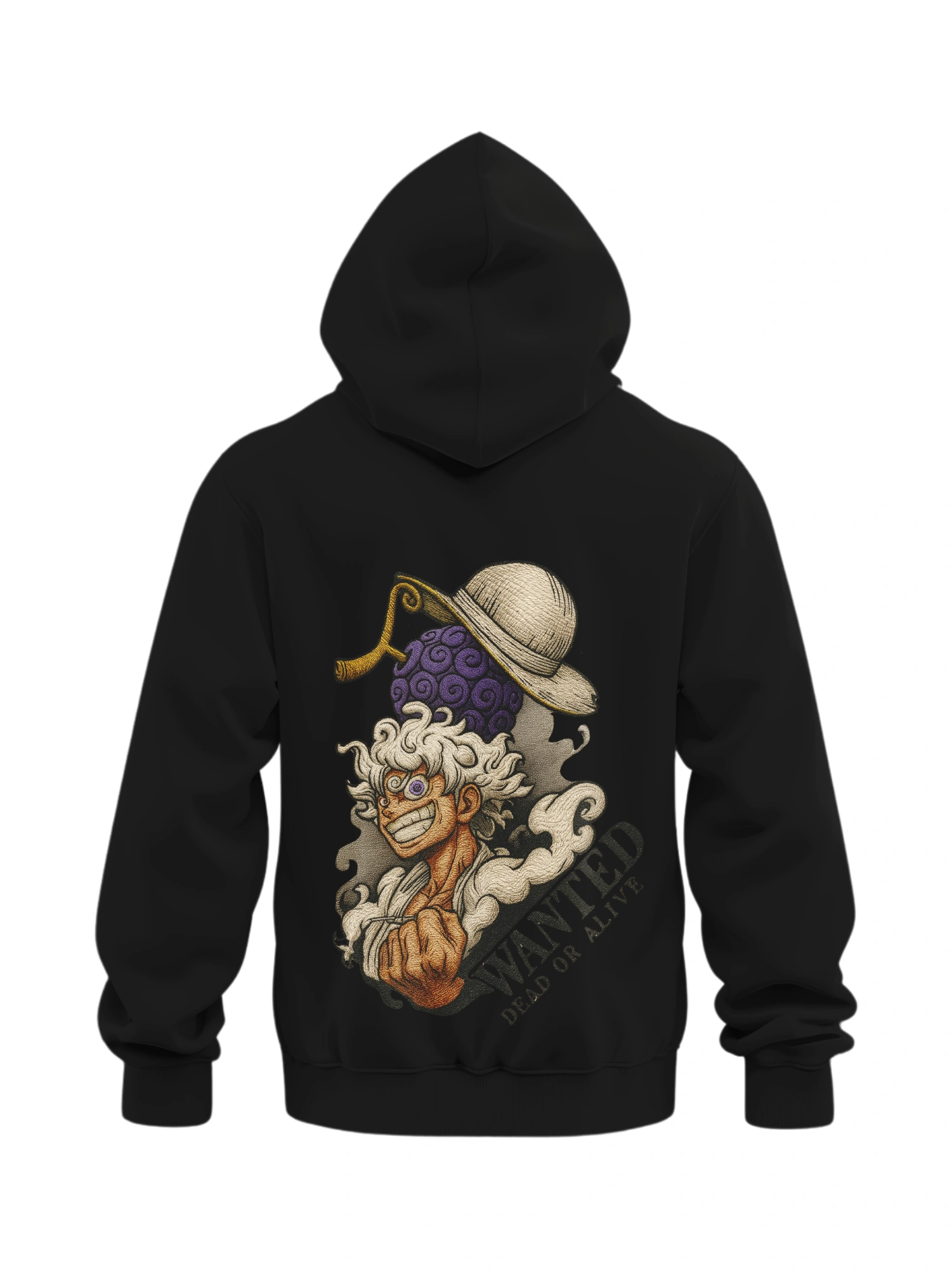 If you arrived from Home, browsed through Shop, or checked out our Customize page, this Luffy Gear 5 Wanted embroidered hoodie stands out as a premium piece for your collection. Be sure to also browse our One Piece character hoodies or the Wanted-poster style hoodies in the Shop for matching designs. This hoodie spotlights Luffy’s Gear 5 transformation in a dramatic “Wanted” poster style, embroidered with sharp details over a deep black canvas. The contrast between dark fabric and bright threads makes the design pop, giving it a bold, iconic look suitable for streetwear and fandom fashion alike.