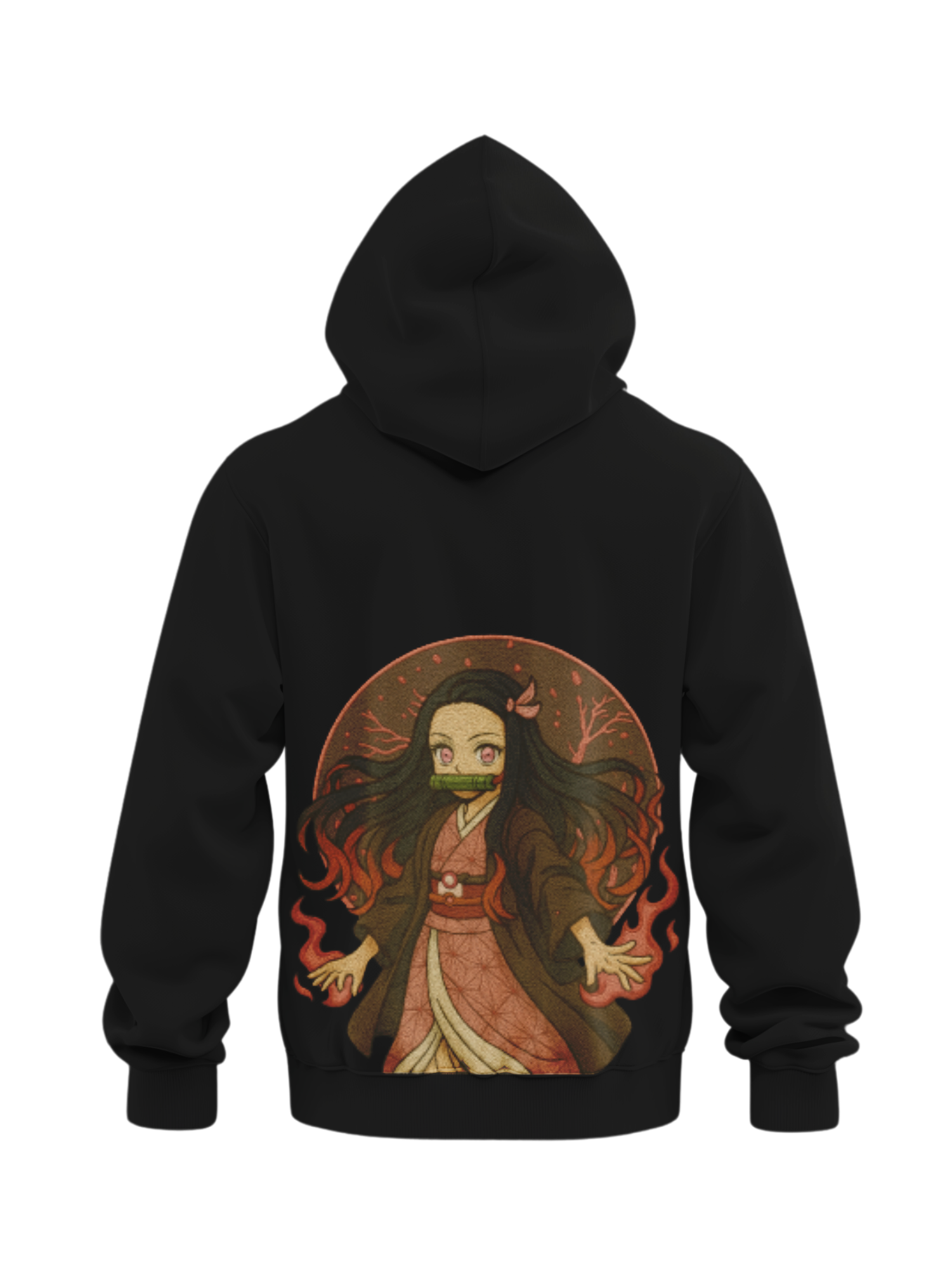 This embroidered hoodie features Nezuko Kamado from Demon Slayer, with flowing hair, fire elements, and her iconic bamboo muzzle. The embroidery is stitched directly into the hoodie, giving it a detailed design that lasts. Part of the Custom Anime Hoodies Demon Slayer collection, this hoodie pairs with Tanjiro, Zenitsu, Inosuke, and Hashira hoodies.