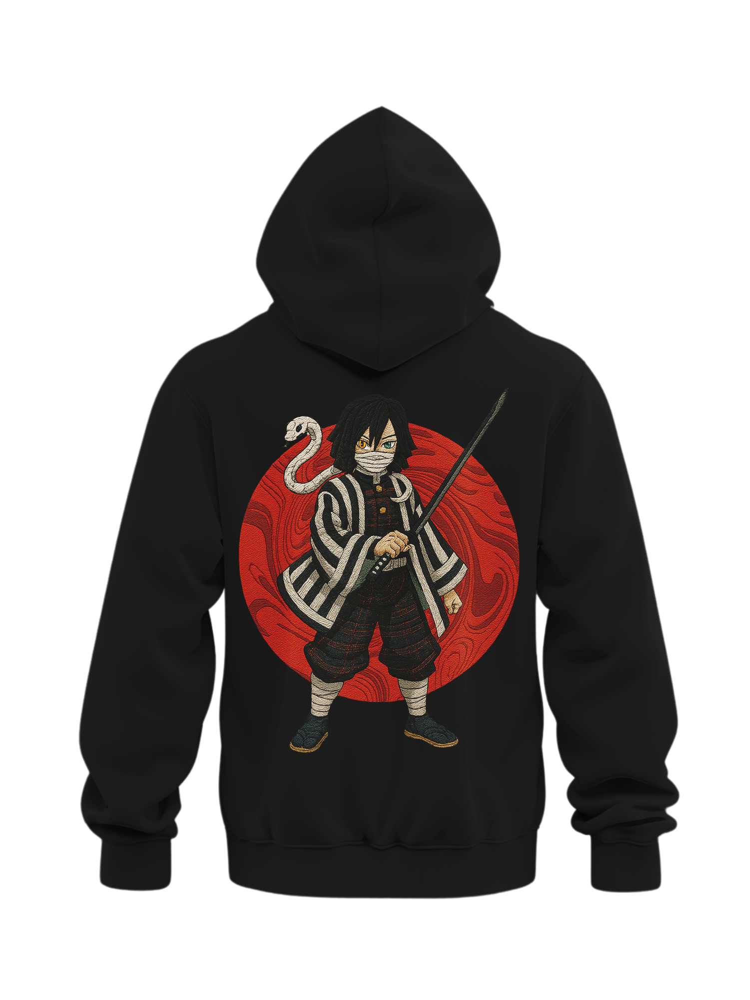 This embroidered hoodie features Obanai Iguro from Demon Slayer, the Serpent Hashira. The embroidery shows Obanai with his snake Kaburamaru against a red circle, stitched directly for lasting detail. Part of the Custom Anime Hoodies Demon Slayer collection, it connects with Shinobu, Sanemi, Muichiro, and Gyomei.