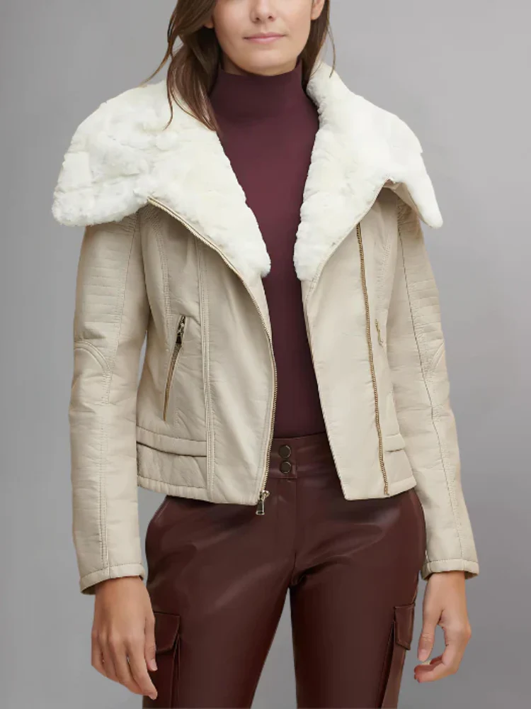 The Women’s Cream Leather Big Collared Jacket is ideal for women who love to experiment with their style or elevate everyday looks.